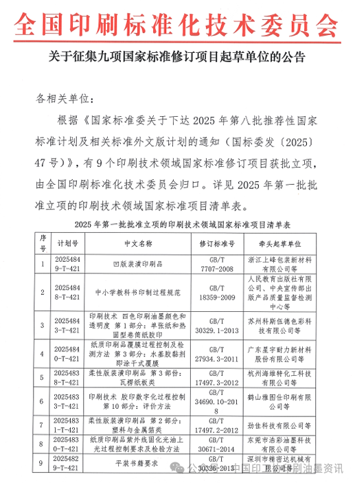 2025年9月15日,全國印刷標準化技術(shù)委員會發(fā)布公告,根據(jù)《國家標準委關(guān)于下達2025年第八批推薦性國家標準計劃及相關(guān)標準外文版計劃的通知(國標委發(fā)〔2025〕47號)》,有9個印刷技術(shù)領(lǐng)域國家標準修訂項目獲批立項。在9個國家標準修訂項目中,中國印工協(xié)印刷油墨分會有三家會員單位牽頭起草修訂工作,分別是蘇州科斯伍德色彩科技有限公司、杭州海維特化工科技有限公司和東莞市浩彩油墨科技有限公司,需要修訂的三項國家標準均是十年前制定,經(jīng)復審后有的標準可能因技術(shù)內(nèi)容落后、指標缺失或?qū)嵤┠晗捱^長等原因,需要及時更新或補充完善。國家標準修訂有助于提升產(chǎn)品質(zhì)量,滿足市場需求,進而提升行業(yè)競爭力。