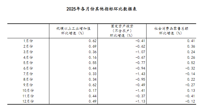 (2)根據季節調整模型自動修正結果,對近一年來各期國內生產總值、規模以上工業增加值、固定資產投資(不含農戶)、社會消費品零售總額環比增速進行修訂。修訂結果及2025年四季度GDP環比數據、2025年12月份其他指標環比數據如下: