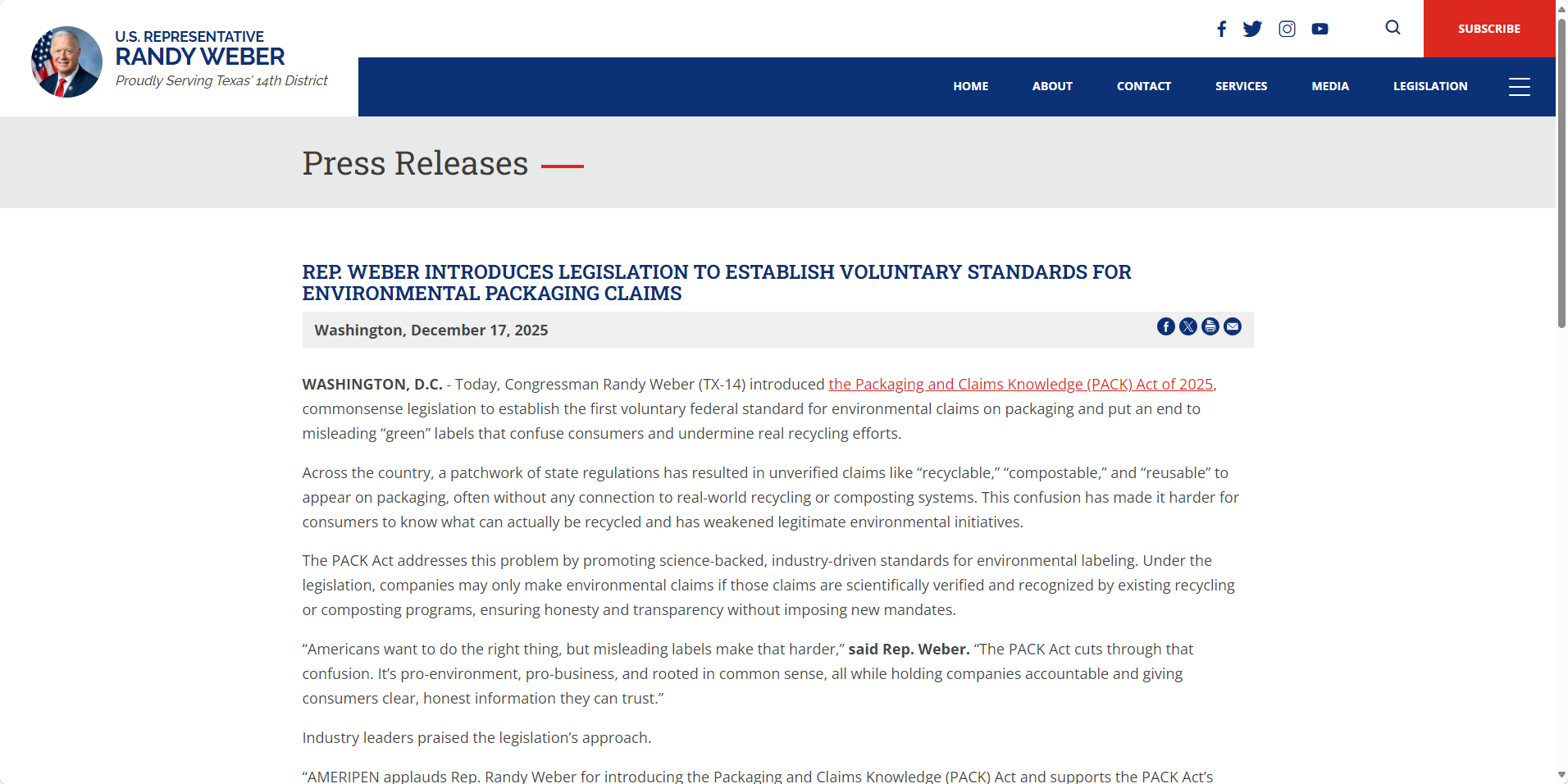 《包裝與循環(huán)經(jīng)濟(jì)法案》0000000000000000000000000000000000(PACK ACT)于2025年12月17日由美國眾議員蘭迪·韋伯提出,在行業(yè)內(nèi)引發(fā)了劇烈震蕩。該法案的核心目的在于統(tǒng)一全美范圍內(nèi)關(guān)于“可回收包裝”聲明的監(jiān)管規(guī)定,終結(jié)長期以來困擾消費者的標(biāo)簽亂象。