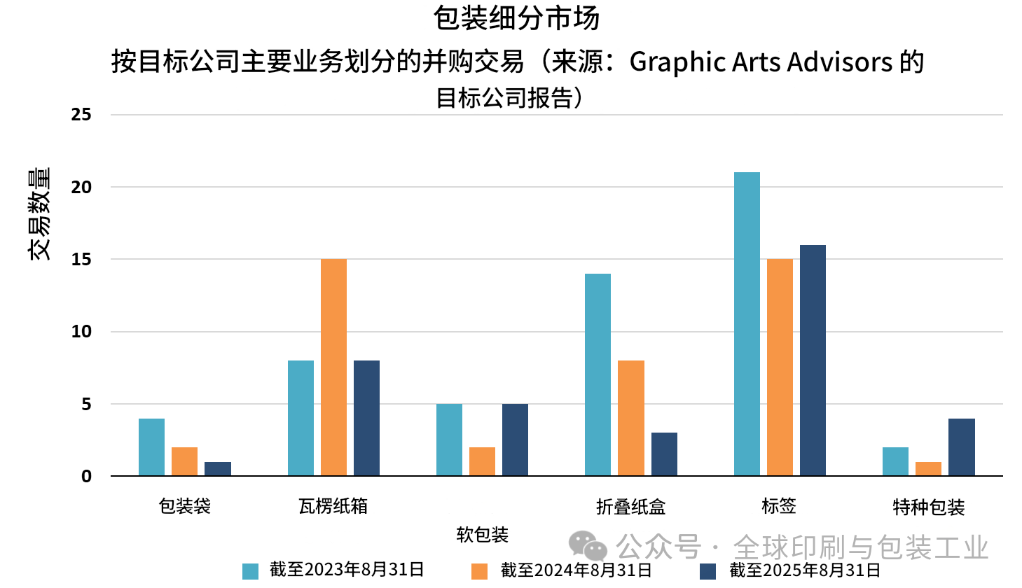 包裝市場連續5年為最活躍細分,但近兩年公開交易數下降。標簽印刷依舊穩健但明顯降溫,過去12個月僅16筆,而2021年為29筆、2022年為41筆(彼時由私募驅動)。瓦楞包裝與折疊紙盒的收購數量較去年下降。