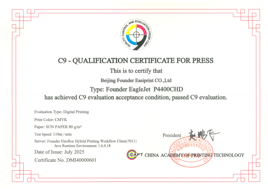 C9認證不是貼紙,而是將嚴苛標準寫入每臺方正桀鷹設備的基因,讓國產噴墨直接對標國際,把“放心、省心、信心”印進每一張紙。