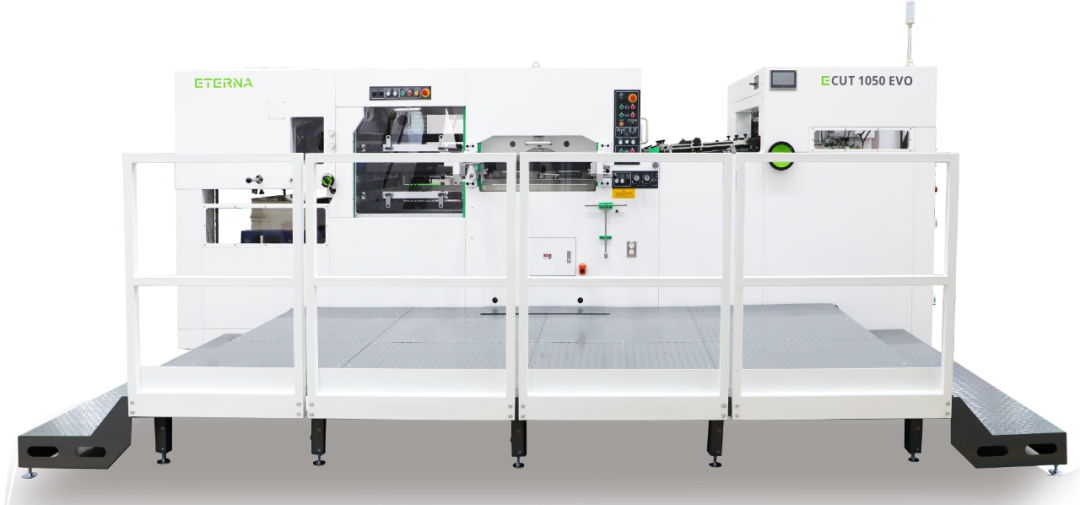 演示中心內一臺具有標志性及創新技術的重磅新品—ECUT 1050 EVO 全自動帶清廢平壓平模切機問世。